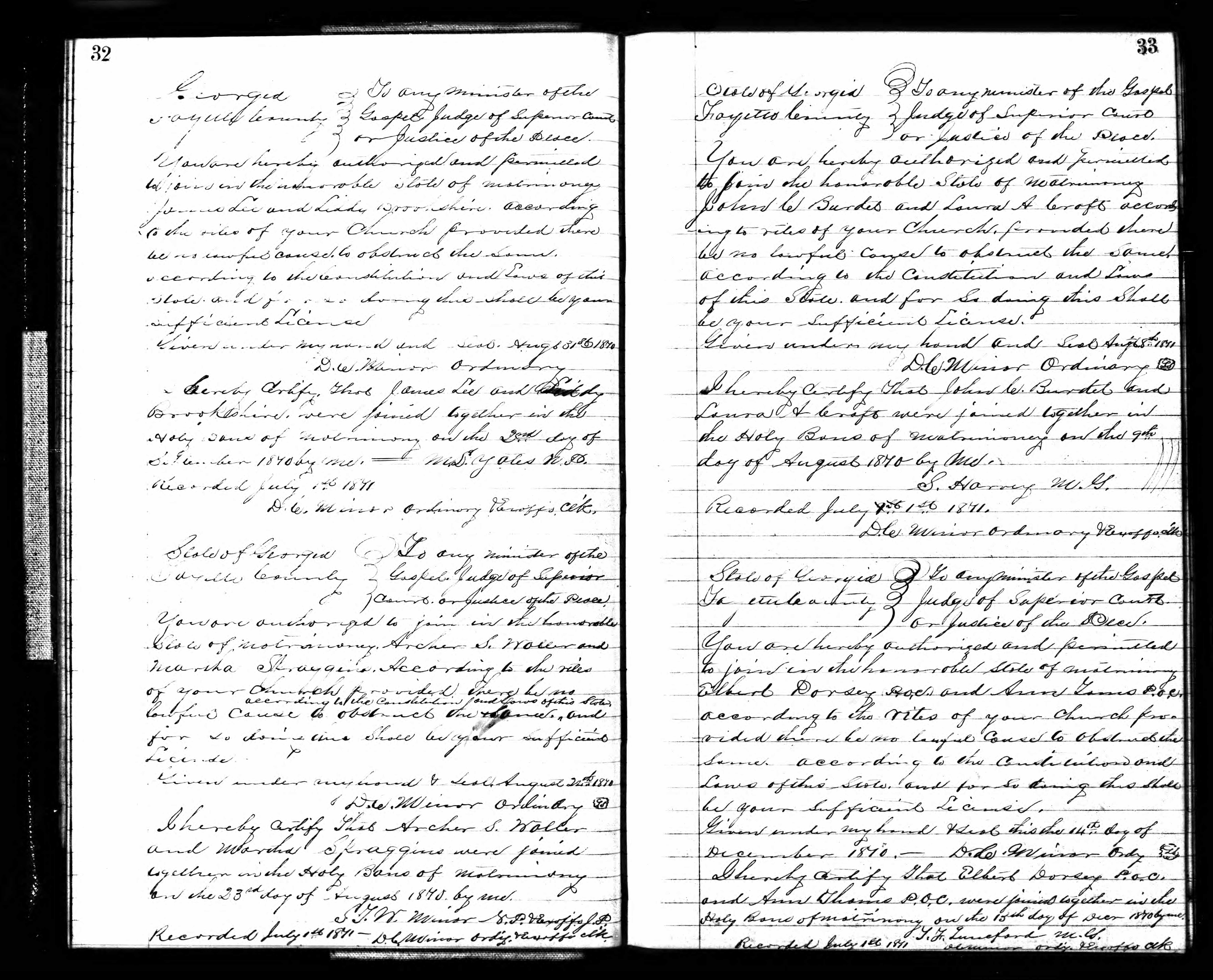 Archer S. Waller & Martha Spraggins - Marriage Record - 8/23/1870