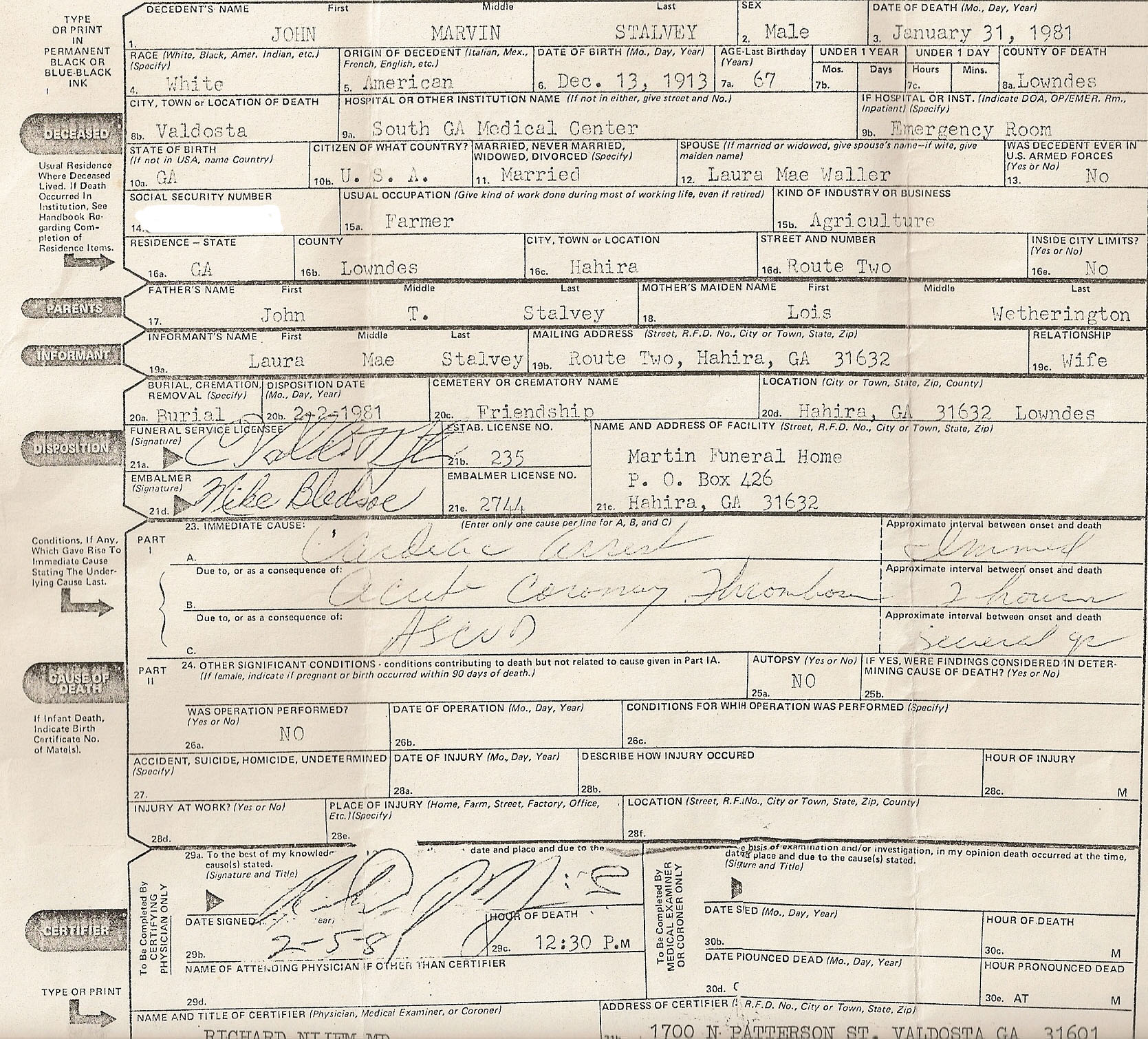 John Marvin Stalvey Death Certificate - 1/31/1981